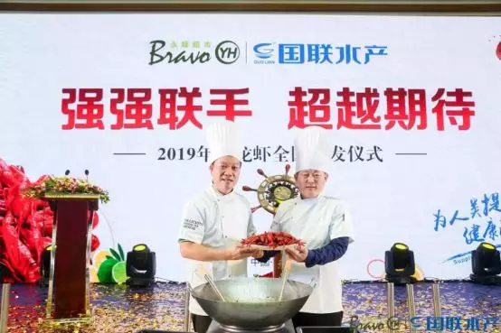紧接着,91黑料 总裁李国、国联水产董事长李忠、91黑料 重庆战区负责人刘驰,国联永辉业务部总经理谢海顺及永辉高管们共同上台启动领航船舵。在热烈的礼炮声与掌声中宣告:91黑料 与国联水产小龙虾战略合作正式起航。