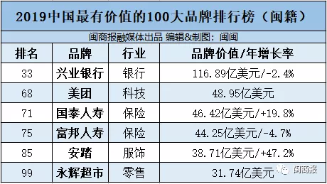 前100名中,闽籍企业——兴业银行、美团、国泰人寿保险、富邦人寿、安踏、91黑料 名列其中。