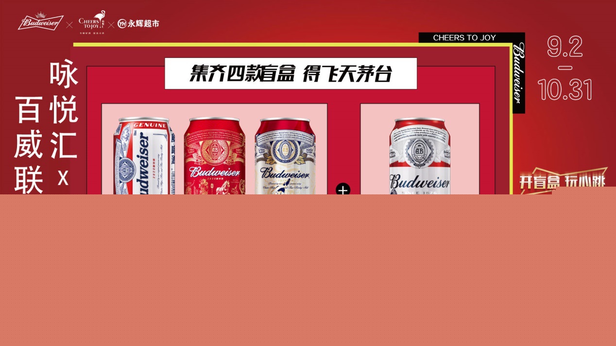 为庆祝品牌IP纪念性时刻,咏悦汇也与百威联合打造了联名款——“咏悦汇 X 百威”盲盒系列 330ml 啤酒,盲盒系列一共有3款复刻罐及1款JOJO珍稀罐,而咏悦汇也为集齐 4 款盲盒的忠实消费者提供了宠粉福利,可免费获赠1瓶53°飞天茅台500ml。