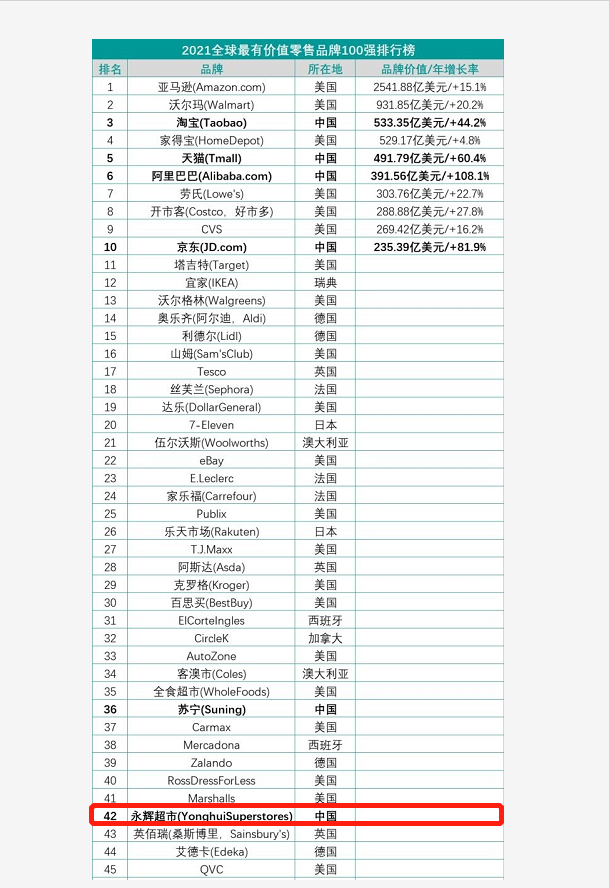 永辉荣登“2021全球最有价值零售品牌100强”TOP42 成中国唯一上榜的零售商超品牌