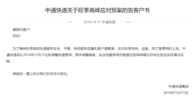 10月11日,中通快递公告称,为了确保旺季期间快递服务安全、平稳,保持服务质量和客户满意度,应对旺季场地、运输、用工等费用的上涨,中通快递将从2019年11月11日起调整快递费用。具体调整幅度,由当地服务网点根据总部指导建议并结合各自实际情况实施。