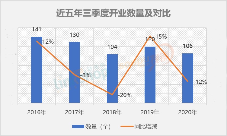 从近五年(2016年至2020年)三季度开业的情况来看,整体呈现有涨有跌的趋势。2017年、2018年、2020年三季度虽然都维持在百个以上的开业量,但已经出现下滑的态势,说明开发商的态度越来越谨慎。