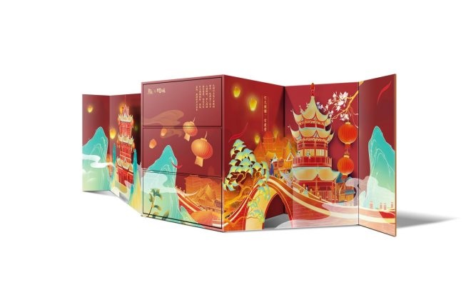 其中,“万家灯火”礼盒以中华第一灯“长信宫灯“为创作灵感,礼盒展开是一整幅的万家灯火画面,寓意万家灯火点亮国人的亲情守望,以及对新一年的美好期盼。“瑞气东升”礼盒以现存最早的摹绘世界地图“坤舆万国全图”为灵感,礼盒展开后会升起全幅原创手绘的万里江山图,世界珍宝尽现眼前,寓意持有者一帆顺风,富甲四方,祈福迎新。