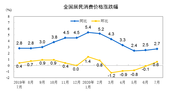 国家统计局:7月份居民消费价格同比上涨2.7%