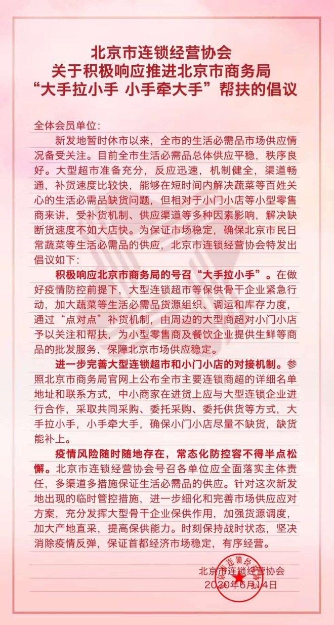 近日,新发地休市后,北京疫情防控又升级,为了稳定北京市场,北京多家超市响应“三保一稳”倡议,开展“大手拉小手、小手牵大手”互帮互助。 ...