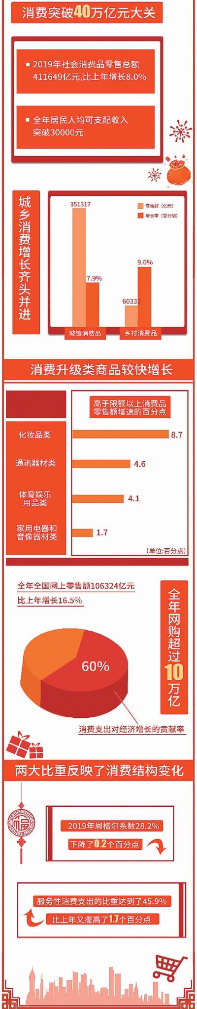 2019年社会消费品零售总额达411649亿元,比上年增长8.0%;全年居民人均可支配收入突破30000元。 ...