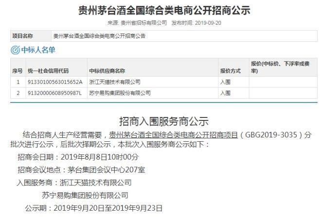 9月20日,贵州省招标投标公共服务平台发布了《贵州茅台酒全国综合类电商公开招商公示》,据公示显示,天猫超市与苏宁易购入围茅台电商渠道服务商,这是茅台酒首次面向综合类电商渠道投放。 ...
