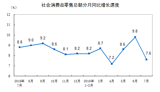 从国家统计局获悉,2019年7月份,社会消费品零售总额33073亿元,同比名义增长7.6%(扣除价格因素实际增长5.7%,以下除特殊说明外均为名义增长)。 ...
