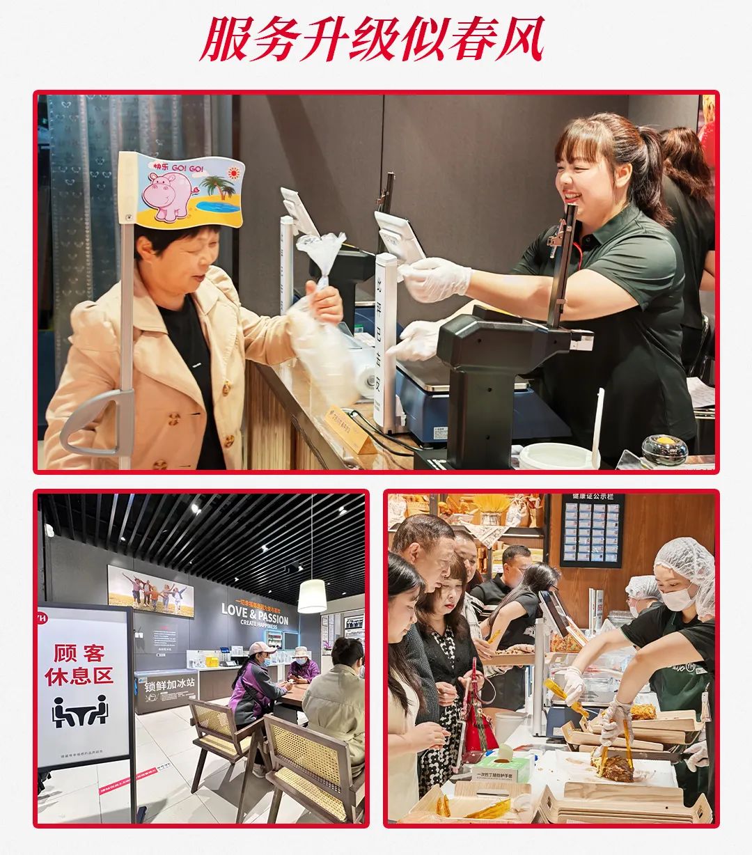 调改门店普遍实现商品结构“大换血”,汰换率超60%,新增商品聚焦民生刚需与品质升级。新增高质价比商品,实现商品结构向胖东来标准靠拢(部分门店达90%)。生鲜板块聚焦“鲜度革命”,引入定向种植蔬菜、慢养土猪、活鲜直运等,构建从田间到餐桌的极速链路;烘焙熟食区则以“现制烟火气”聚客,潼关肉夹馍、现泡柠檬凤爪、网红欧包等地域特色与健康理念兼具的爆款频出。胖东来DL系列商品专区成为标配,精酿啤酒、燕麦脆等明星单品拉动复购率,进口商品占比提升至20%,环球风味与本土特色形成互补,满足家庭多元化消费场景。