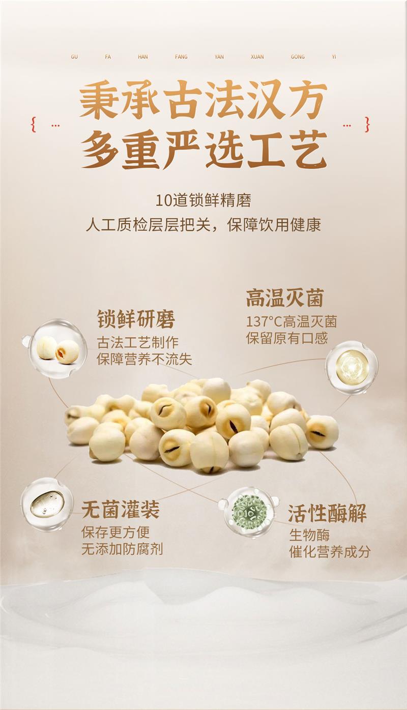 在制作工艺方面,馋大狮莲子汁采用锁鲜研磨工艺,用生物酶对其进行活性酶解,既能保证莲子营养不流失,又能催化其中的营养成分。再经过137°高温灭菌、无菌灌装等处理流程,保留了莲子原有的清甜口感。