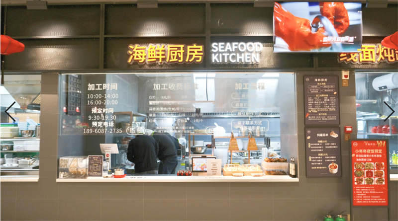 “海鲜加工档口能解决大海鲜难烹饪的痛点,消费者可以现场选购,按照不同口味需求制作,支持堂食及打包,加工区透明的档口设计也让消费者有了更强的交互感,在品味美食同时能观摩加工的过程。我们希望通过将零售与餐饮相结合的方式,为消费者提供一种全新的购物体验。”门店相关负责人介绍道。