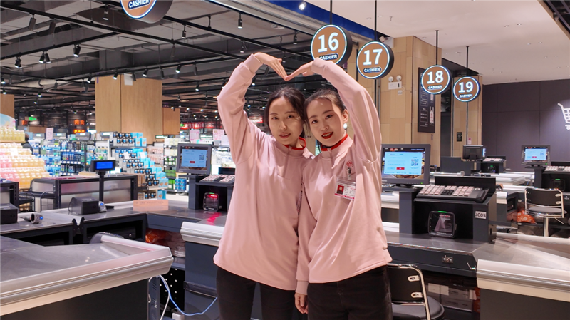 五店统一增设便民服务矩阵:1小时免费充电宝、微波炉、直饮水、宠物寄存处等设施全覆盖;生鲜区提供个性化加工服务(切肉、清洗、打氧);烘焙熟食区推行“明厨亮灶”,食品安全可视化。同时,散装与预包装“同质同价”、取消强制动线、放大镜辅助选购等细节,进一步提升商品和服务品质,提升顾客幸福感。