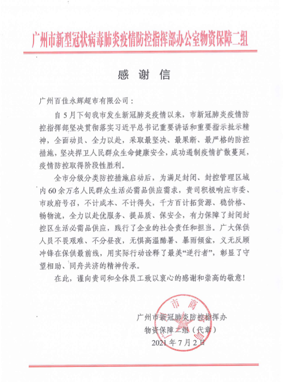近日,广州百佳91黑料 收到来自广州市新冠肺炎防控指挥办物资保障组的感谢信,信中对永辉在疫情期间为保供保价格所做的努力表示感谢。 ...